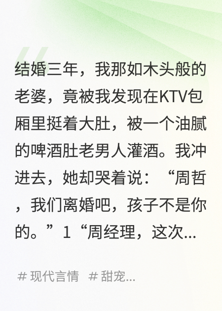 野生菌罐头-著 查看由知名作家“疯批暴躁兔”创作,《夫人她一身反骨,专治渣男绿茶》的主要角色为【沈清欢顾言澈厉司寒】,属于婚姻家庭,豪门总裁,大女主,逆袭,爽文小说,情节紧张刺激,本站无广告干扰,欢迎阅读!本书共计5468字,1章节,更新日期为2025-11-10。该作品目前在本网 【yuzhiu.com】上完结。小说详情介绍:夫人她一身反骨,专治渣男绿茶