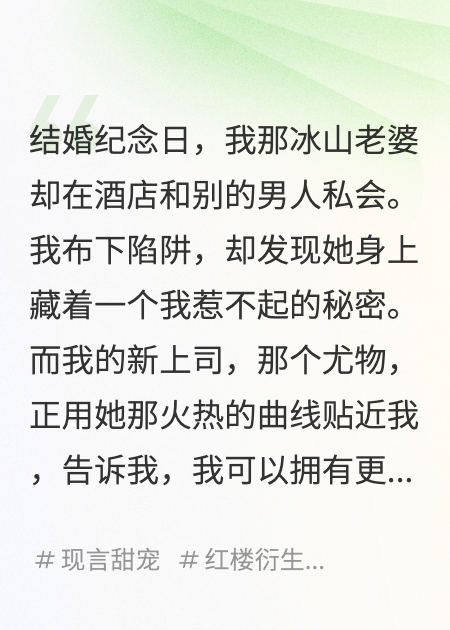 于冰心-著 查看小说《婚房里的陌生香水:冰山老婆的秘密》的主要角色是【郑雪郑明王凯】,这是一本现言甜宠,红楼衍生,职场,家庭,虐文小说,由新晋作家“于冰心”倾力打造,故事情节扣人心弦。本站无广告,欢迎阅读!本书共计5434字,1章节,更新日期为2025-11-10。该作品目前在本网 【yuzhiu.com】上完结。小说详情介绍:婚房里的陌生香水:冰山老婆的秘密